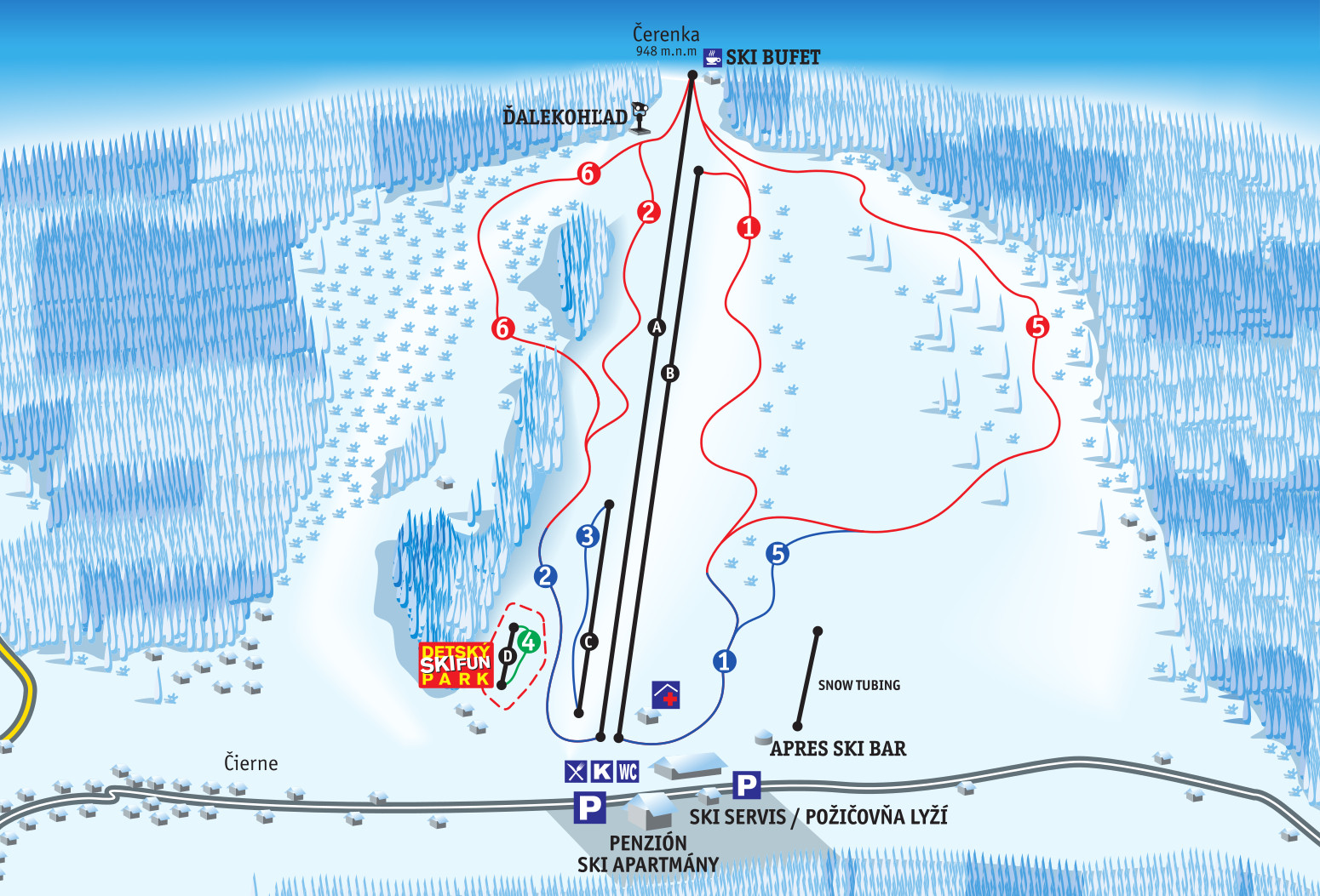 In the resort, just next to the ski lifts, there is a newly build buffet with the possibility of sitting inside or on a covered terrace with a wonderful view of the ski slopes. Skiers have the option of refreshments in the buffet at the upper lift station, directly on the ridge Javorníky, where a nice view of the resort and Beskydy. There is also a children skifun park, snowtubing, snowpark, snowboarding and ski rental and ski service. For the beginners, we offer ski and snowboard school and ski kindergarten. Tourist - recreational cross-country ski track passes through the ridge Javorníky through top Čerenka 948 m, while the ridge to ski lift exports and supplies to the ridge Beskydy.